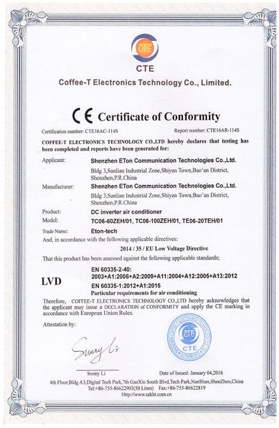 Norme:CE Nombre:CTE16AR-114S Prescription Date:2016-01-04 Portée / Range:Industrial DC air conditioner(LVD) Délivré par:CTE |