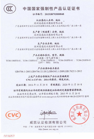 Norme:3C Nombre:2015180703000848 Prescription Date:2016-11-29 Date d'expiration:2020-11-19 Portée / Range:Air conditioner Délivré par:CVC |